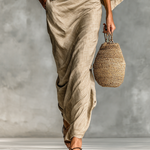 Ez a két részes dizájn egy laza, hosszú ujjú denevér stílusú felsőt és egy hosszú, folyékony szabású szoknyát mutat be, tökéletes egyensúlyt teremtve a kényelem és a kifinomultság között.