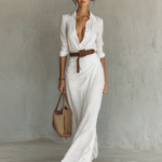 A Victoria ruha a sophisztikált és időtlen dizájnjával tűnik ki, ideális különleges alkalmakra. Magas minőségű anyagokból készült, könnyed és kényelmes érzést nyújt, kiemelve az alakot eleganciával. Hosszú és folyékony vágása és a fordított gallérja révén sokoldalú ruhadarabbá válik, tökéletes laza megjelenésekhez vagy formális öltözetekhez.