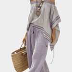 Csíkos bambusz felső, nyitott vállakkal és széles nadrágokkal az elegáns és friss stílusért