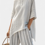 A nyugodt stílus modern vonalakkal. A Daisy szett aszimmetrikus pólót kombinál laza szabással és csíkos nadrágot semleges árnyalatokban, létrehozva egy kiegyensúlyozott, friss és elegáns megjelenést meleg éghajlati viszonyok között.