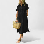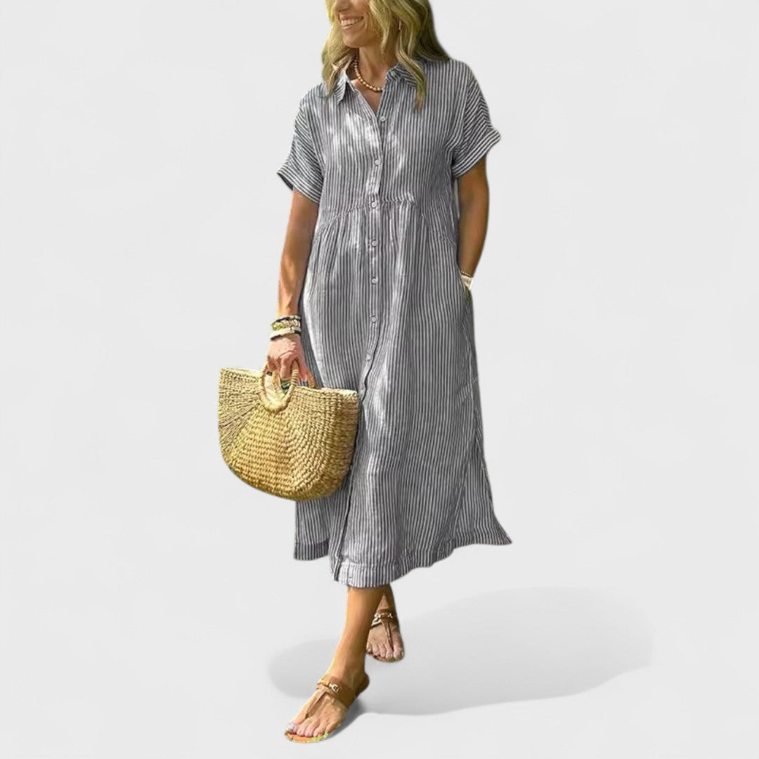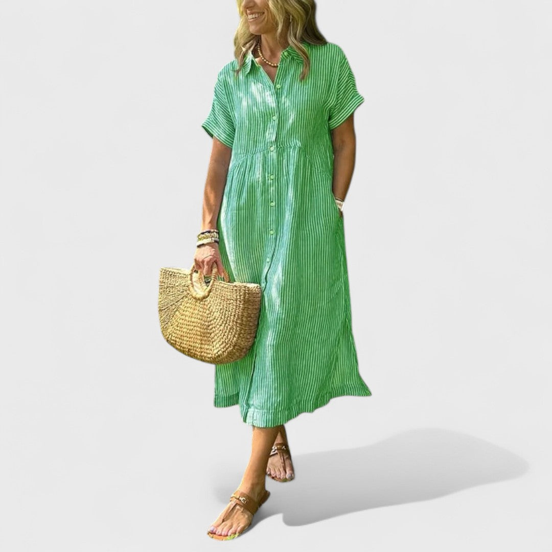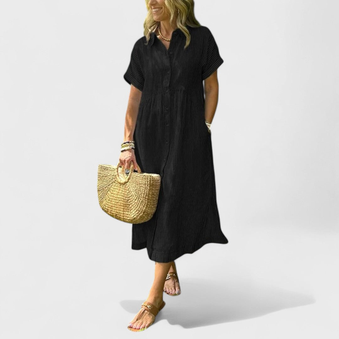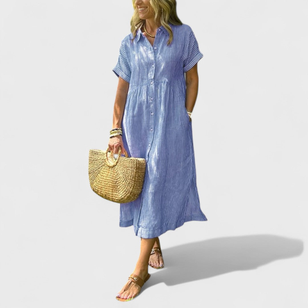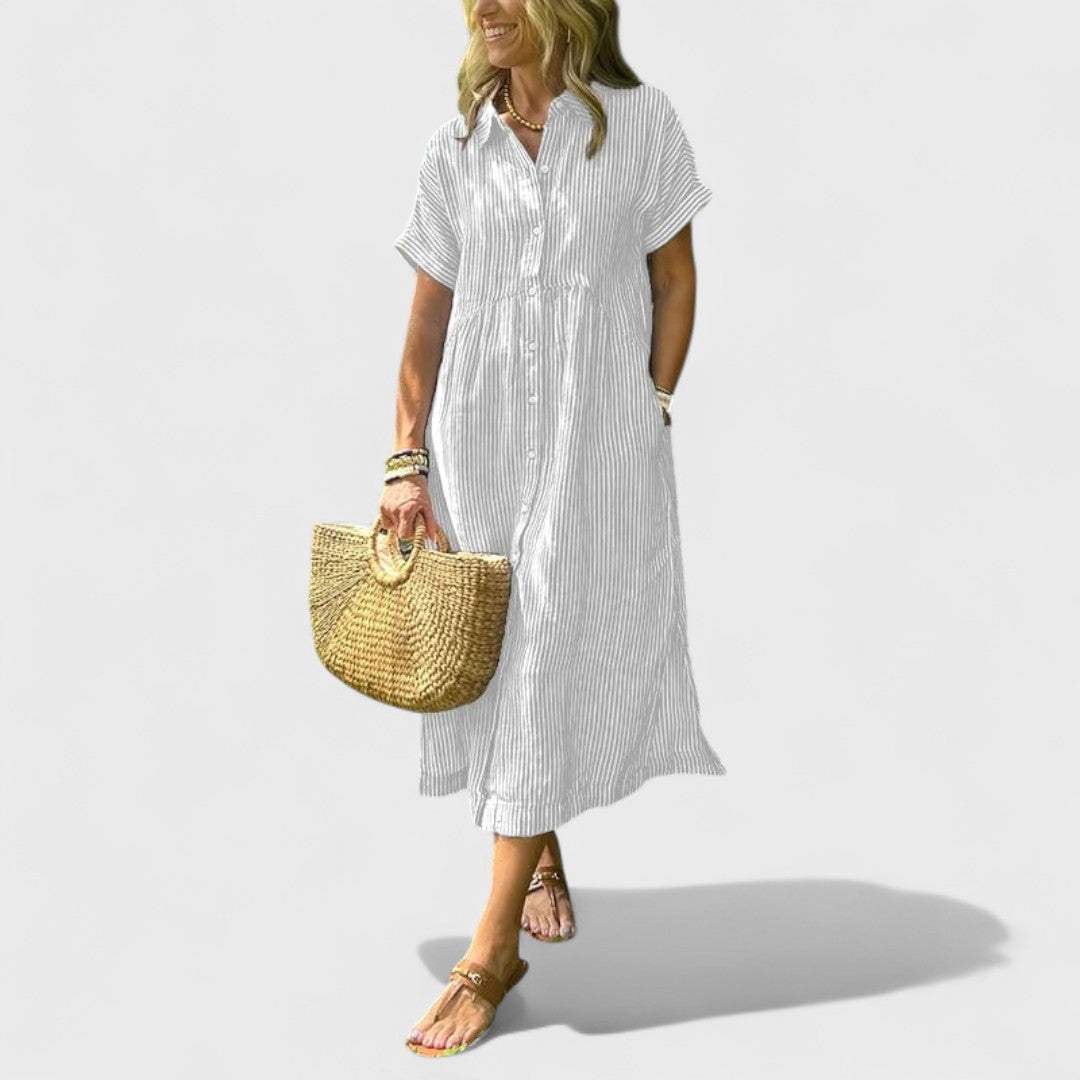 Az Angela ruha hosszabb fazonja és örök klasszikus szabása gyönyörűen kiemeli a derekat, és lágyan körülöleli a testet. Puha, lélegző anyagból készült, ideális forró nyári napokra, romantikus estékhez és ünnepi pillanatokhoz a városban.