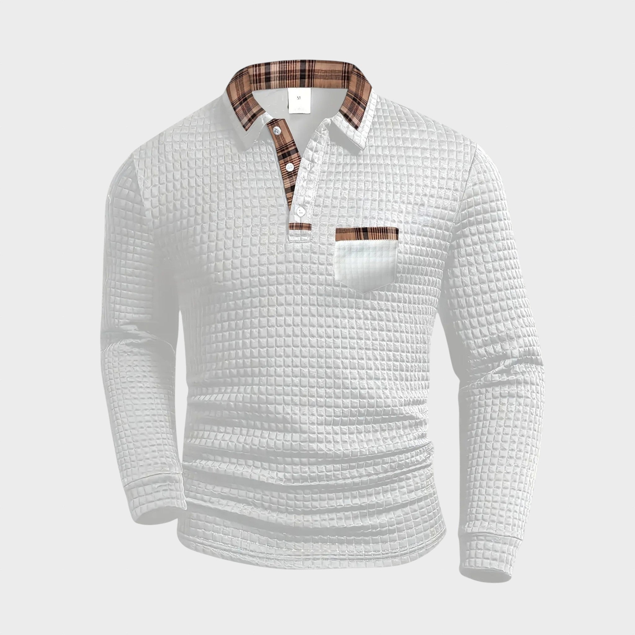 A finom szövet struktúrája modern és férfias megjelenést kölcsönöz, míg a kontrasztos kockás gallér további karaktert ad hozzá.