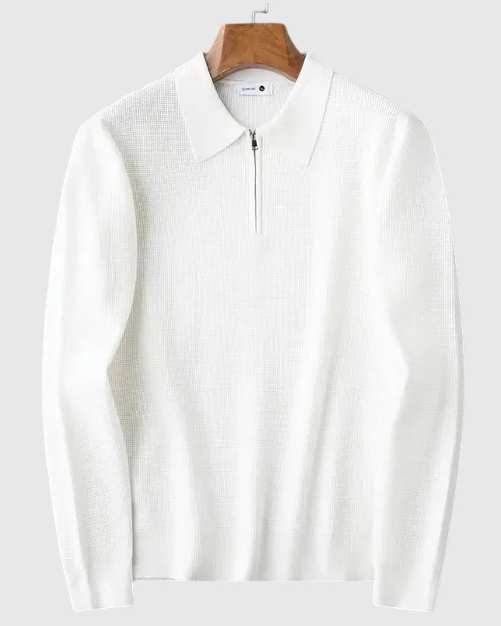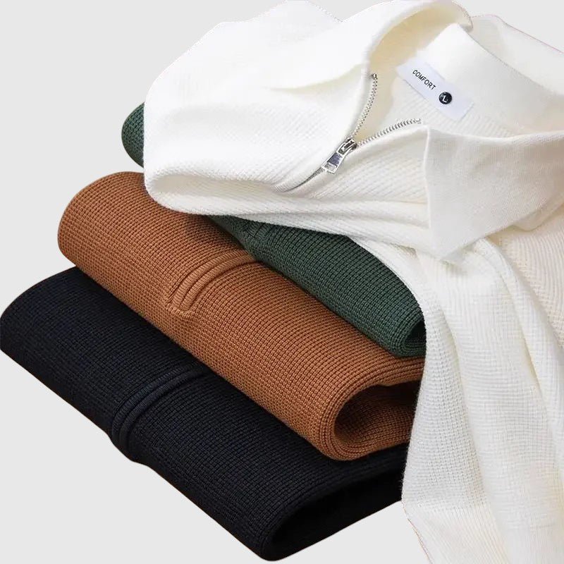A férfi cipzáras Elegant pulóver azok számára készült, akik értékelik a időtlen kifinomultságot praktikus árnyalattal. Magas minőségű anyagból készült, könnyű meleget és elegáns, testhezálló sziluettet biztosít - ideális rétegezéshez, hétköznapi sétákhoz vagy smart-casual környezethez.