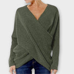 ✔️ Elegáns V-nyakú dizájn: A modern keresztbetett V-nyak és az aszimmetrikus szegély stílust ad ennek a pulóvernek.