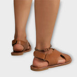 Ez a barna pántos szandál egyszerű, modern dizájnjával tűnik ki, miközben kiváló kényelmet kínál viselés közben. A keresztezett elülső pánt stílusos megjelenést biztosít, míg a saroknál lévő állítható tépőzár biztonságos rögzítést és könnyű fel- és levételt kínál. A finom kontrasztos varrásokkal ellátott lapos talp ideális társ minden nyári naphoz.